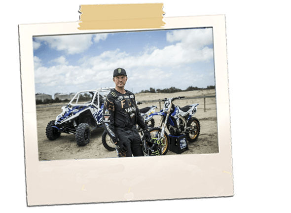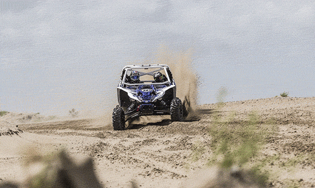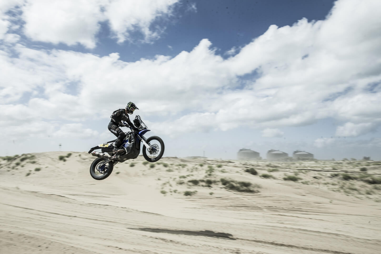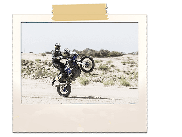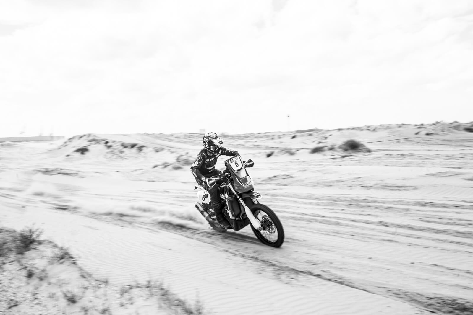 Adrien nous invite à bord pour « garder l’équilibre pendant les sauts ». Les photographes s’en donnent à cœur joie et grimpent dans le monstre mécanique pour profiter de la dextérité du motard… au volant d’un buggy donc. Le vent ne faiblit pas, mais le pilote enchaîne les tours de pistes à coups de sauts de gazelle entre les bosses. Le volant est précis, le pilotage engagé, la sensation de vitesse insensée et les sauts effrayants (de l’intérieur). La météo est difficile, le sable défonce littéralement le matériel. Mais devant la disponibilité du pilote et son engouement à faire découvrir sa passion, sautant de dune en dune après de rapides briefing avec le photographe et le vidéaste, ces derniers donnent tout eux aussi. Quitte à dire adieu à certaines optiques photos. Il troque ensuite ses quatre roues contre sa moto de Dakar et enchaîne les passages sur le sable, sur une roue, sur deux roues, en l’air, en travers, etc… Le décor est lunaire. Sans les immenses cheminées au loin vers Calais, on se croirait au milieu d’une spéciale un jour de Mistral (ou l’équivalent local). Sur un terrain de quelques centaines de mètres carrés, il déroule son répertoire au guidon d’une Yamaha WR450F et démontre son habileté dans les ornières.