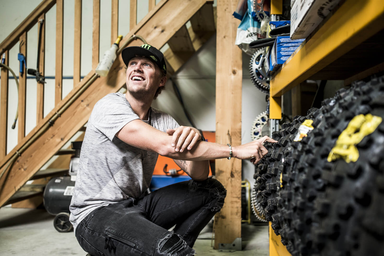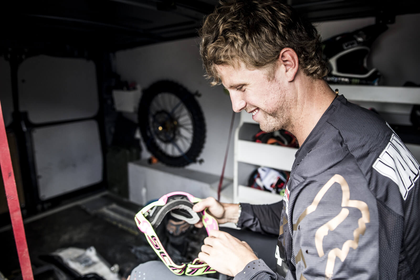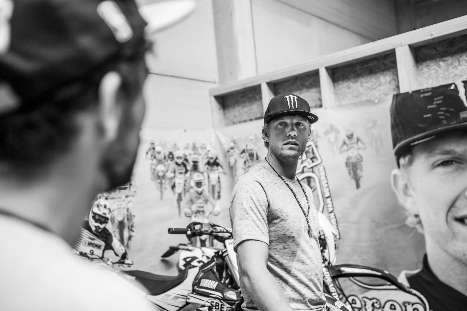 Après d’âpres négociations pour trouver un créneau dans son emploi du temps surchargé, nous voilà enfin chez lui dans le Nord-Pas-de-Calais. Avant de s’envoler pour disputer une course au Chili, ce pilote de moto professionnel d’1.87m pour 85 kilos a accepté de nous faire partager son quotidien, de se glisser dans les bottes d’un motard habitué à manger du sable, de la boue et de la poussière. Ce 3 août 2017, la pluie est de la partie mais elle n’entame pas sa bonne humeur.