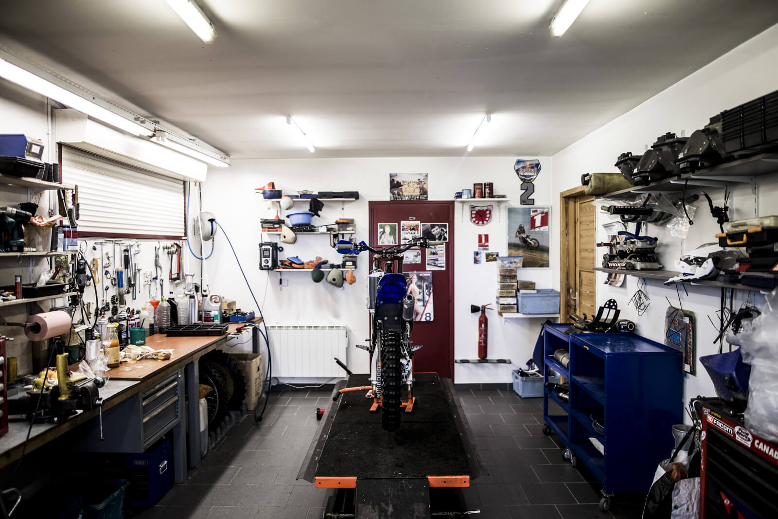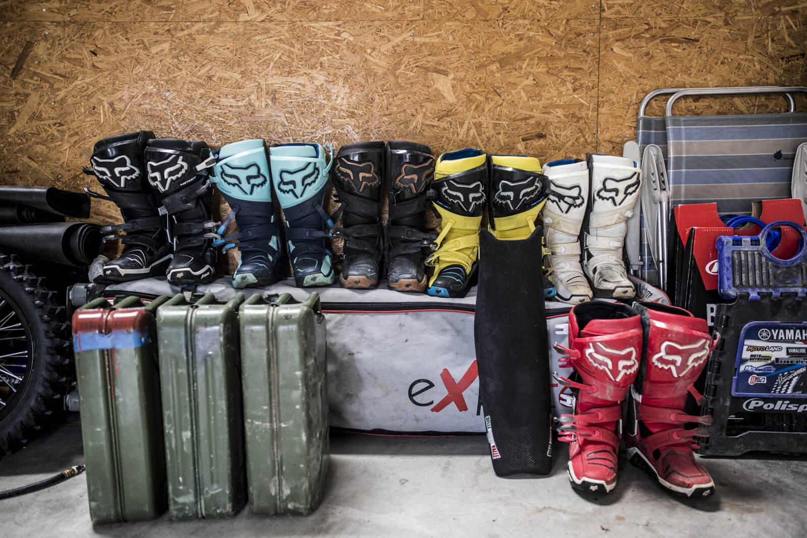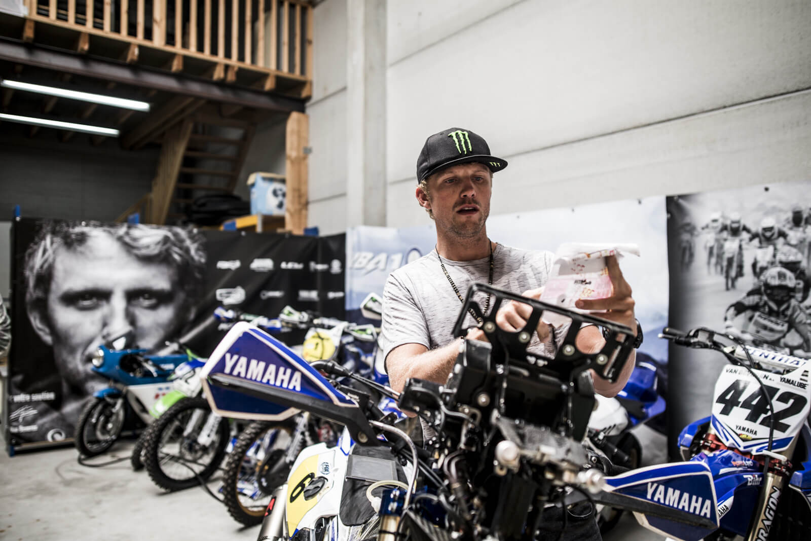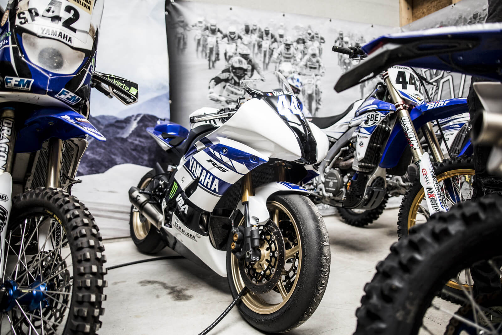 On retrouve le lendemain à l’aube Adrien et son staff au garage. Il déboule avec son Mercedes GLC AMG 43 et s’amuse de nous voir au volant d’un Porsche Macan S bleu Klein. « Ça va les gars. C’est un beau bébé ça », plaisante-t-il. On prend le petit-déjeuner en passant en revue les motos. L’atelier est impeccable. Un énorme buggy Yamaha XVS trône au milieu, rutilant. Derrière une cloison en bois, on découvre une série de motos en rang d’oignons devant une bâche à l’effigie du pilote sur sa moto dans les dunes. Juste devant, le modèle grandeur nature encore dans son jus, couvert de boue. A côté, une étagère dédiée aux pneumatiques. Sable, route, piste, tout est minutieusement répertorié en fonction des motos et des épreuves. « Sur sable, on a une moto différente de celle du Dakar. En rallye-raid avec les étapes qui s’enchaînent, j’ai besoin de pièces en cas de casse ou d’usure. Et puis il y a des modifications pour embarquer plus d’essence, le roadbook avec le dérouleur mécanique, le GPS, etc… Pour les pneumatiques, on a des ‘bibs’, des couronnes de mousses qui se glissent dans le caoutchouc extérieur. Sans ça, on passerait notre temps à réparer les crevaisons, ça serait un enfer. Pour le sable, on a une base de motocross plus classique. Mais pour les pneus, on a carrément développé des reliefs spéciaux. Ça ressemble à des pales disposées de manière presque perpendiculaires au pneu pour accrocher dans le sable ».