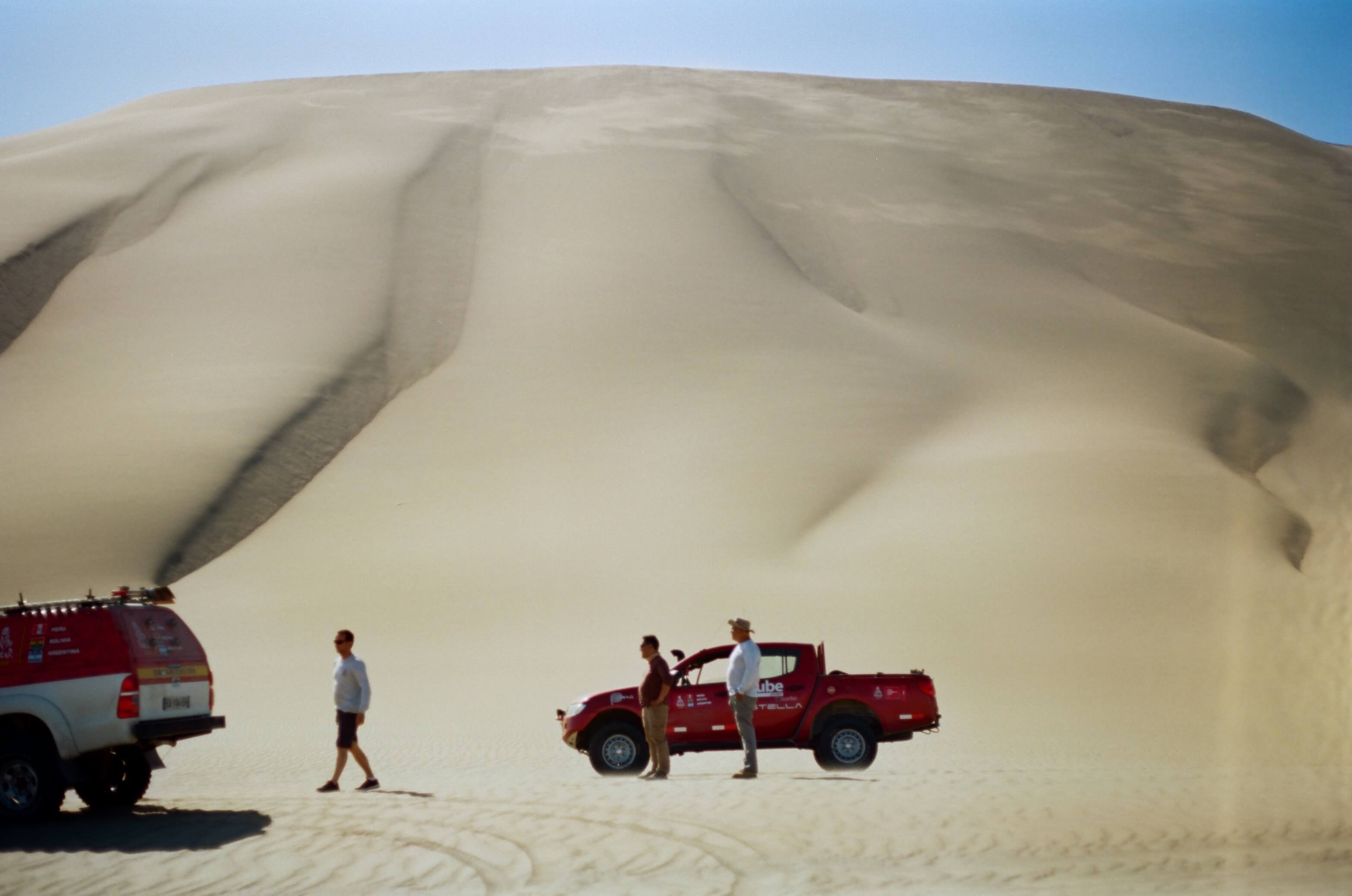 Une fois harnaché, on quitte la capitale péruvienne en direction d’Ica, trois cents kilomètres plus au sud en bordure de côte. On emprunte la mythique panaméricaine - Carretera Panamericana Sur - pour le point de départ du Dakar. « Pour cette 40e édition du Dakar, il faut bien comprendre que le début va être compliqué. Les premières étapes sont dans le sable et plutôt complexes. Il y a beaucoup de travail de navigation”, annonce Coma accoudé à la fenêtre de sa portière avant d’entamer un balais de gonflage et de dégonflage des pneus qui va durer quatre jours pour nous et au moins une quinzaine pour eux (GQ participe à la première partie des recos). « Lors de trois étapes, les départs et les arrivées ont lieu sur le même site. Il faut se faire quelques noeuds au cerveau afin de bien organiser l’ensemble », explique l’ex-pilote de moto.
