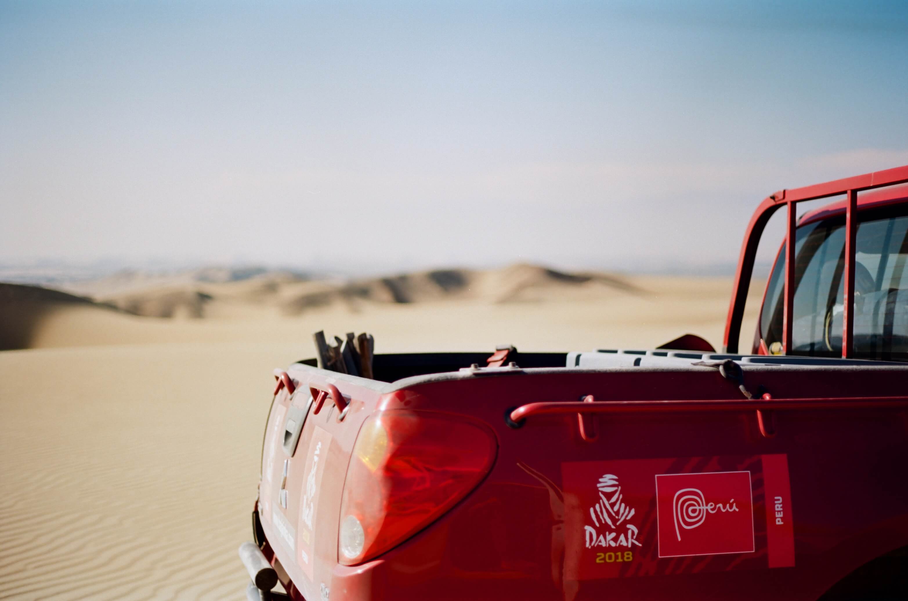 Après un vol chaotique depuis Paris, nous arrivons au dessus de Lima, baignée dans un nuage de brume épais entre les montagnes poussiéreuses et inhospitalières en bordure du Pacifique. N’y voyez-là aucun romantisme à la manière de l’écrivain Antoine de St-Exupéry. Loin des éloges du pionnier de l’aéronautique et auteur de Vol de Nuit, cet effet esthétique n’est hélas que le fruit de la pollution. Nous le comprendrons une fois sur le tarmac. Le gigantesque port commercial et le vent venu du nord impriment une atmosphère poisseuse. Francesco dit Fran, le bras droit de Marc Coma, nous accueille et nous invite à le rejoindre dans son pick-up aux allures de véhicules de spationaute. Les bagages sont glissés dans des sacs en plastique rendus hermétiques par un scotch épais. « Dans les dunes, le sable se glisse partout. On n’a pas trouvé mieux pour épargner nos affaires de la poussière », nous lance-t-il rieur avec un accent argentin prononcé. On grimpe à bord. Et l’avant transformé de la cabine double de l’Hilux nous met tout de suite dans l’ambiance. Au poste de conduite, un siège baquet avec un système de ceinture de sécurité à quatre points d’ancrage et un volant, tout de même. Côté droit, le même siège Recaro mais en lieu et place de la boîte à gant, une panoplie d’écrans digne d’un rayon hi-tech de la FNAC. Pas moins de quatre GPS en tous genres dont un tactile de près de quinze pouces avec les cartes satellites de Google Maps. Un arceau de sécurité traverse tout l’habitacle. On le déroule du regard pour finalement tomber sur un autre siège baquet au milieu de la banquette arrière. A sa droite, une glacière, à sa gauche, un bidon d’eau carré immense. Fixée au plafond, une radio avec un micro déporté comme dans les séries policières américaines. A peine sortie de l’aéroport, il faut jouer du klaxon et des pares-chocs pour se frayer un chemin dans l’une des villes les plus congestionnées au monde. Après trente minutes de galères pour rejoindre un petit hôtel situé à seulement un kilomètre du parking, Fran nous invite à manger : « Il faut en profiter. Pendant les recos, on mangera beaucoup moins bien ». Message reçu. Après un repas plus que copieux, on file se reposer quelques heures avant le lever aux aurores.