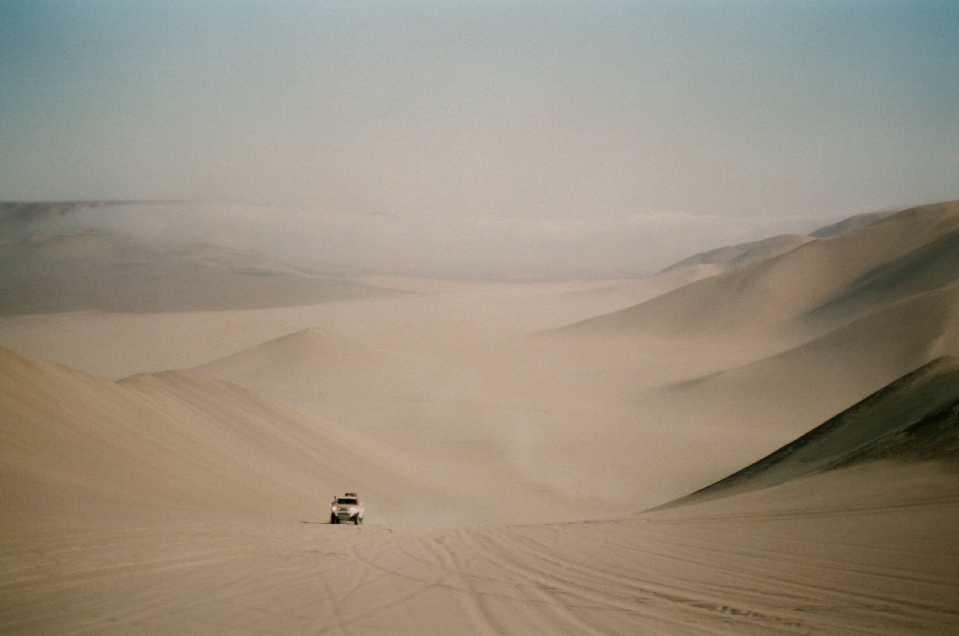 La nuit tombe. On décide de se reposer dans une auberge située à proximité. Le lendemain, à l’aube, on repart. Les militaires nous ouvrent la voie. Les GPS sont en alerte et les multiples traces correspondant aux différentes étapes scintillent comme des guirlande de Noël sur l’écran de Fran. La voie nous mène à l’océan Pacifique. Le spectacle impressionne par sa pureté. Il n’y a rien ni personne à perte de vue. Timidement, nous longeons la plage pour ne pas défigurer le décor jusqu’à arriver à une cabane de pêcheur. Un Péruvien solitaire nous accueille, partage son déjeuner en demandant quelques nouvelles de la ville. Un court répit avant de le voir au loin nous faire de grands signes des bras au départ des pick-up en guise de bonne aventure.